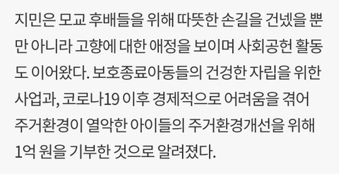 지난해에는 코로나19로 갑자기 경제적으로 어려움을 겪는 후배들의 소식을 듣고 학생들을 위한 후원금을 건넸다. 학생들이 자신의 꿈을 포기하지 않고 꽃을 활짝 필 수 있게 마음을 전달한 것이다.지민은 모교 후배들을 위해 따뜻한 손길을 건넸을 뿐만 아니라 고향에 대한 애정을 보이며 사회공헌 활동도 이어왔다. 보호종료아동들의 건겅한 자립을 위한 사업과, 코로나19 이후 경제적으로 어려움을 겪어 주거환경이 열악한 아이들의 주거환경개선을 위해 1억 원을 기부한 것으로 알려졌다.