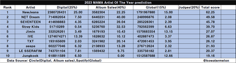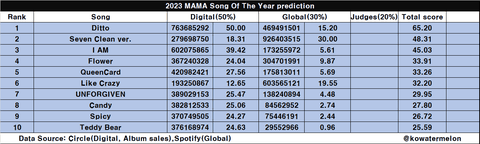 노래상 정국- 세븐 : 뉴진스에게 둘다 안줄거같고, 정국이 글로벌 만점이라 심사점수 몰빵 가능