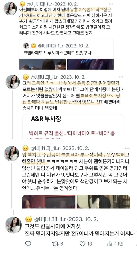 특정 회사 직원이 지위를 이용해 정국이를 혼자만 푸쉬해줬고 그걸 빅히트에서 모르는 사람이 없다고 함( 우리 악개이모는 최소 회사 고위급 직원임ㅋ, 진지하게 묻고 싶은데 악개이모 근데 직업은 있어요?궁금..)