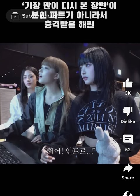 어텐션 무대영상 보는데 민지가 가장 많이 본 파트 어디지? 하고 확인하러감 -> 인트로였음 -> 해린 안 믿기는지 내가 다시 확인해볼래..! 하고 자기가 다시 확인해봄 -> 인트로임 ㅋ -> 자기 파트가 아니어서 충격 받았는지 허.... 인트로,,,