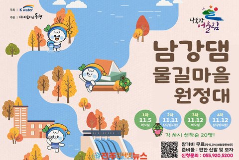 한국수자원공사 주최 (주)아름다운 동행 주관하여 진양호 탐방, 까꼬실 및 진주 남강 습지원 탐방, 저자와의 북토크 등 댐과 마을을 체험하는 문화·생태 프로그램 '남강댐 물길마을 원정대'의 참여자를 모집 한다.