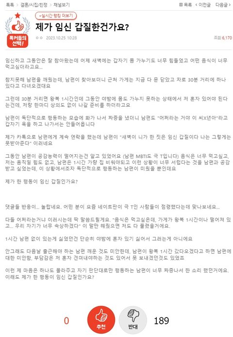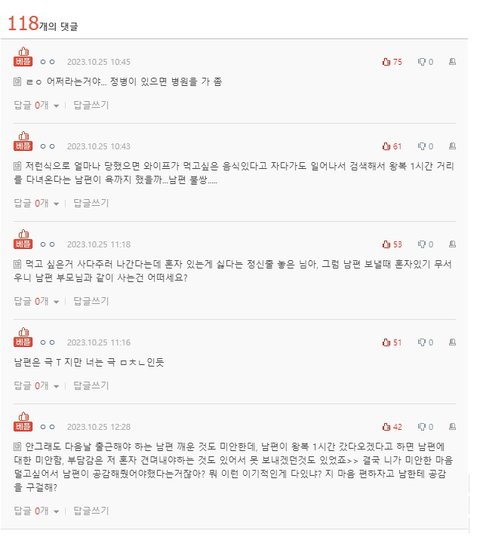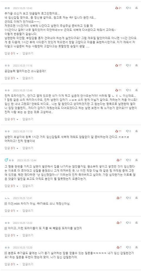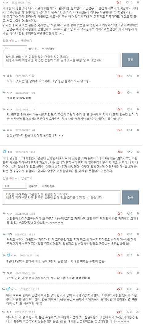 조카 극 F인데 내가 남편이어도 욕 했을 듯,,그렇게 갑자기 아내가 야밤에 깨웠는데 그냥 아무 말 없이 음식 사러 왕복 1시간 거리 가려고 했던 거 자체에 감동인데,,남편이 30분 거리에 있다고 할 때 자기 혼자 있어야하니깐 안 먹어도 되겠다고 하던가 준비할 동안은 뭐하다가 다 준비하니깐 짜증내냐,,착한 남편이니깐 참고 욕만 했지,,진짜 이상한 남편이었으면 경찰 왔을 듯,,