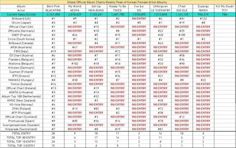 걸그룹 차트인 순위 (1. 뉴진스 18개국 ) (2. 르세라핌 16) (3.아이들 10) ( 4.에스파 9) (5. 엔믹스 4 ) (6. 아이브 2 개국) 해외인기 따져 봐도 저 지표 맞는듯... ╋ 톡선 보내는 ㅂㅇㄹ 얼마나 열심히 하느냐가 인기지표가 아님