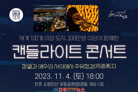 진주시는 한국관광공사와 함께 야간관광 특화 7개 도시 '대한민국 밤밤곡곡' 행사와 연계하여 오는 11월 4일(토) 오후 6시부터 약 70분간에 걸쳐 진주시 망경동 163-13 소재 소망진산 유등공원에서 '캔들라이트 클래식 콘서트'를 개최한다,이날 행사에는 도담 앙상블, 플룻 조다은, 클라리넷 강철주, 바이올린 김민화, 첼로 정혜주, 피아노 강현민, 쉘로 트리오, 생황/피리 박지영 등이 함께한다.