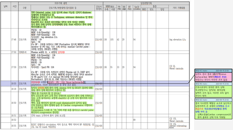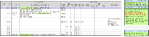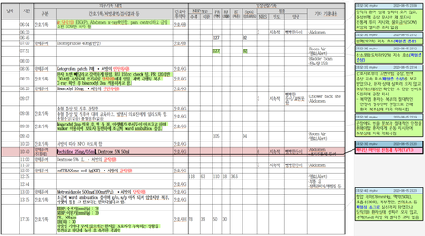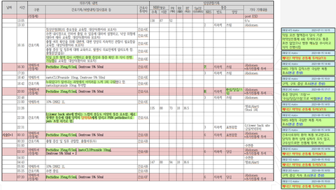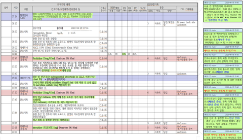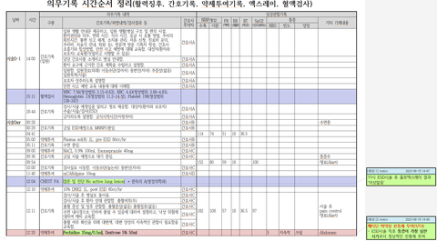 이 자료는 간호기록, 혈액검사(CBC), 엑스레이, 약제투여, 활력징후 기록을 시간 순서로 나열한 자료입니다.