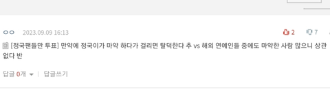 근데 방탄이 진짜로 마약 해도 타격 1도 없음... 정국 팬들만 하더라도 이런 마인드임 (자꾸 누가 댓글 수정한거라 하는데 댓수정 아니고 원래 이거임 모바일에선 댓수정 안 돼서 모바일 마크 안 뜸)