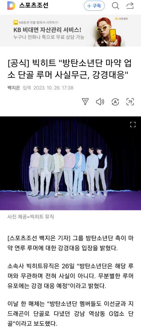 [공식] 빅히트 "방탄소년단 마약 업소 단골 루머 사실무근, 강경대응"