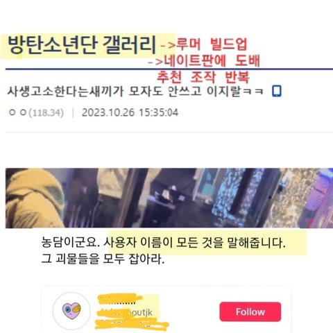 또 팬이 찍은 밥먹는 영상을 악의적으로 잘라서 그 스토커들이랑 어떻게든 엮어보려는 안티 쓰갤할머니들 다 고소 부메랑 맞아 모자 안쓴것도 죄로만드는 정신병자들아 니들이 아무리 루머 빌드업하고 조작해도 똑똑한 정상인이 훨씬 많음