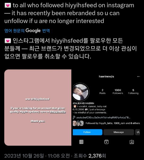 10만 팔러워 넘은 케플러 휴닝바히에 팬 계정이 뉴진ㅅ 해린 팬계정으로 변신