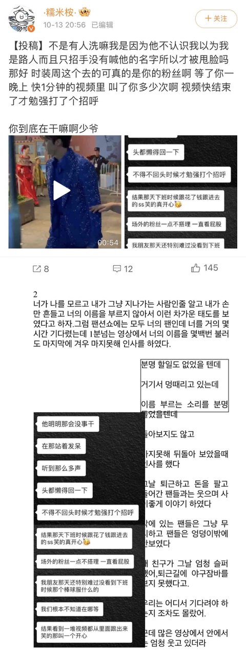죄2: 팬들에게는 무표정이지만 호텔이나 비행기에서 만난 팬들에게는 자주 웃음을 날린다.영상1은 데뷔 7년차의 팬인데 영상 업데이트 한번도 늦은적이 없고 최선을 다해 팬층을 단단하게 유지하고 있는데 다른 팬들에게 선물 전해주는 영상