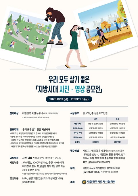 ■ 공모주제 : 우리 모두 살기 좋은 지방시대- 주도적인 지방정부 정책 현장의 참여나 지역발전 체험 사례- 현재 거주하는 지역의 매력적인 요소와 주민들의 자부심- 지방과 수도권의 격차 또는 중앙 집중화로 인해 불편했던 경험- 지방시대 실현이 대한민국에 가져올 긍정적 변화 등 지방시대 실현에 대한 기대와 필요성에 공감할 수 있는 사진 또는 영상 콘텐츠