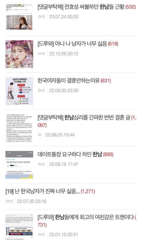 한남타령하면서 남탓하고 정신승리 해댈 시간에 느그 열등감이나 고치고 사회적으로 밈화 된 '여적여'에 대해서 반성이나 하세요 여초 언냐들아 ^^