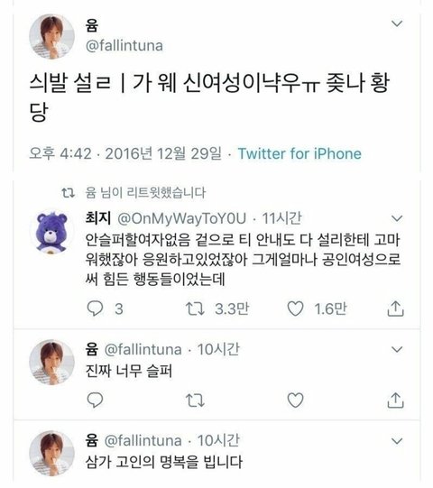 이런식으로 여돌들은 데뷔도 전부터 온갖 억까 + 루머에 시달리고 데뷔하고 데뷔한 몇년 후에도 끊임없이 억까 + 인신공격 + 루머 + 논란 생성 등등 여러가지로 많이들 당함