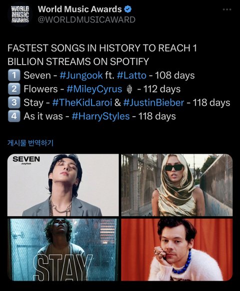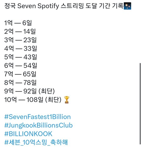 세븐이 발매 108일만에 스포티파이 10억 스트리밍 달성해서 스포티파이 역사상 가장 빨리 10억 스트리밍 달성한 곡됨