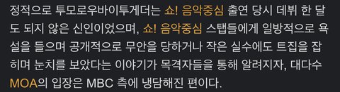 ㅌㅂㅌ한테 너무하긴 했지 그전에 ㅂㅌ한테는 저거 보다 더 심하게 ㅈㄹ했음 아무튼 음중은 개 별로야 갑질 pd 예능 국장이면 나아진게 없지