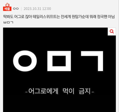 365일 24시간 정국글에가서 안티자료만 올리는 니가 할말은 아닌거 같은데? 이제 테일러님 팬코중이야? ㅋㅋㅋㅋㅋㅋ