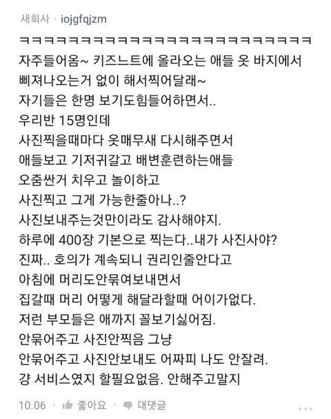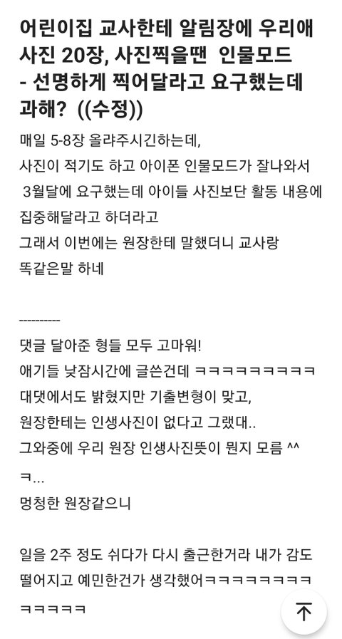 어린이집 교사한테 알림장에 우리애 사진 20장, 사진찍을땐 인물모드 선명하게 찍어달라고 요구했는데 과해?