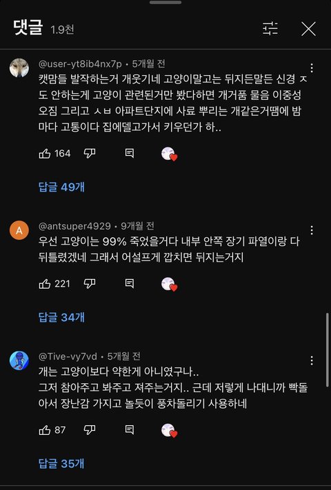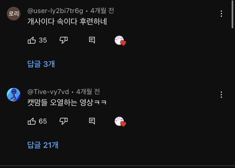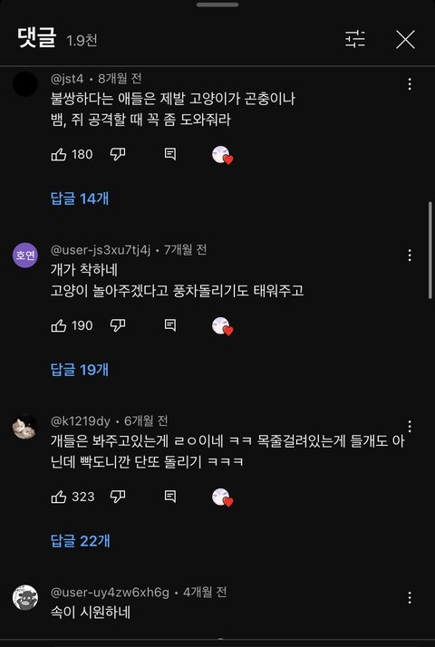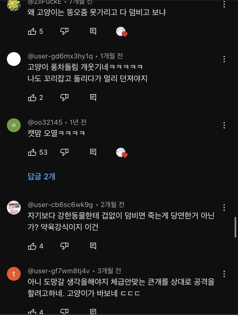대형견이 고양이 물어죽이는 영상 댓글 이천개가 거의 다 저 모양이더라ㅋㅋ 답글 많은 건 정상인 하나가 대댓글로 뭐라 하면 한남들 몰려와서 캣맘 ㅍㅆㄱ 어쩌고 하면서 거품 물어서 그럼 우연찮게 저 영상에 도태남들만 모였다기엔 나도 걍 쇼츠 넘기다가 우연히 나온 알고리즘 탄 영상임 그냥 한남 수준이 저게 평균인거야