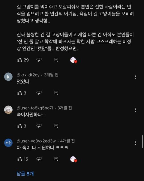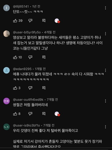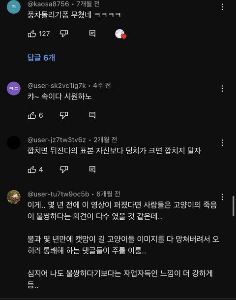 고양이 혐오 영상에 ㅍㅆㄱ 거리는 것부터가 고양이 혐오가 뭘 향한 굴절 혐오인지가 너무 투명하게 보여서 웃기다ㅋㅋ..