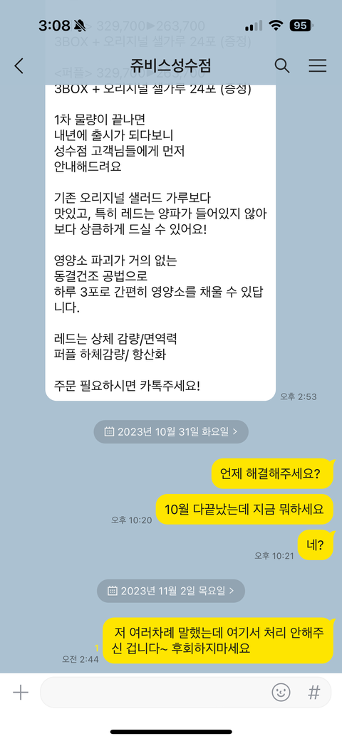 어이가 없어서 말이 안나오는게, 그럼 한달 관리동안 거의 2주정도는 흰곰팡이 핀걸 계속 섭취했다는건데 이걸 관리해주는 전담 코치는 사진을 보고도 전혀 눈치 못채고 계속 쓸데없는 소리만 하면서 잘난척 한게 말이되는소리며 여기 성수점에서 돈을 잔뜩써서 결제하게 한 권000 담당자분은 적어도 이런 사태가 벌어졌다고 하면서 고객이 연락을 했으면 사과라도 하거나 혹은 어떤 대응이라도 해주려고 해야할텐데 아무런 대응없이 나몰라라 입니다. 심지어 제 담당 CT는 저한테 하지도 않았던 소리를 했다고 우기고, 했던말만 계속 반복하는데 자기가 관리하는 고객이 계속 흰곰팡이낀 자기네 식품을 먹었으면 적어도 부끄럽고 미안해서라도 저는 그런식으로는 대응 못할거 같습니다. 제가 여기 성수점에 전화해서 곰팡이낀거 만약에 발견 못하고 남은음식 계속 섭취했으면 아무도 성수에 계신분들은 지적 안해주시고 그냥 계속 쭉 제가 곰팡이 먹게 두실거 아니였냐, 그게 과연 맞냐라고 물었을때 아무도 제대로 대답 못하셨습니다. 그리고 현재 곰팡이낀거 먹은만큼이라도 환불해주거나 혹은 대체제로라도 제대로된 보상을 달라고 했지만 아무 답변도 없고 카톡도 읽씹에 자기들 멋대로이네요. 심지어 처리는 커녕 자기네들 다이어트 식품 사라고 광고 카톡만 보내네요..