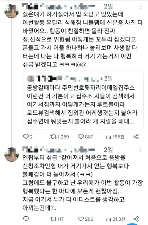 남들 다 듣는데서 주소불러봐, 주민번호 뒷자리까지 불러봐는 기본이고 아파트 외관 어떻게 생겼냐, 택시타고 온 사람도 있는데 집까지 가는 길 설명해봐, 동호수 반대로 말해봐, 팬들 전화기 가져가서 뒤지고 범죄자 대하듯이 대함
