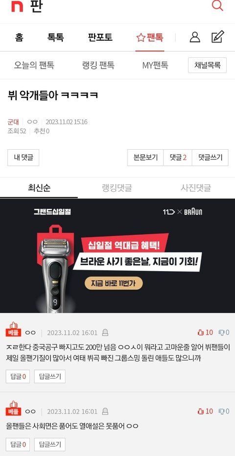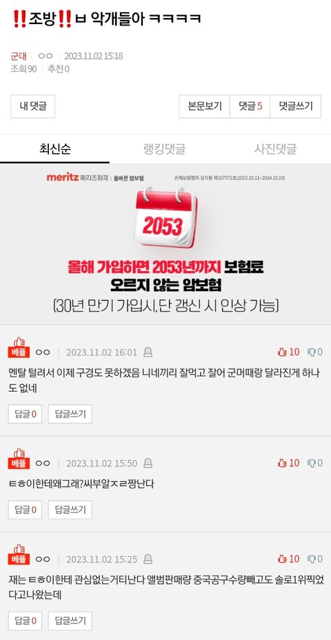 원글이랑 조방글이랑 추천수가 아예 똑같음 근데 밑에 원글 보면 어그로가 쓴 댓글이랑 팬이 쓴 댓글 구분않고 그냥 똑같이 숫자 맞춰서 베댓을 보냄 그냥 심심한건가..? 아까 봤는데 숫자 일정히 계속 올라가고 보통 베댓이 되는 10까지는 그냥 그렇게 쭉 올라감