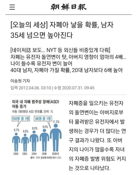 저 연구는 오류라고 밝혀진 연구임. 남자의 연령을 고려하고 연구한건 맞는데, 아내의 나이를 입력하지 않은 심각한 오류를 범함. 출산한 아내의 나이를 입력한 결과 산모의 나이를 따라가는 걸로 결과값이 도출됨.