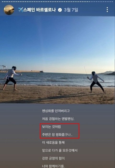 전청조남현희 바다에서 펜싱하는 사진봣냐