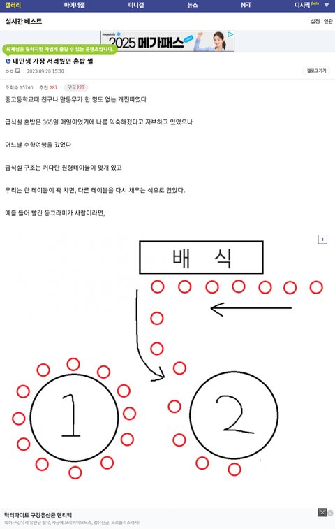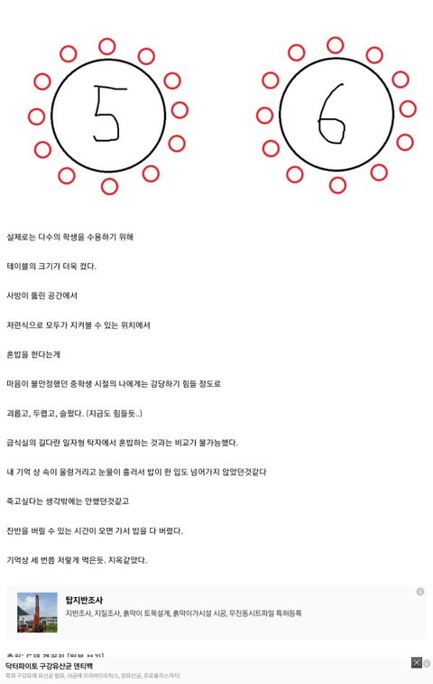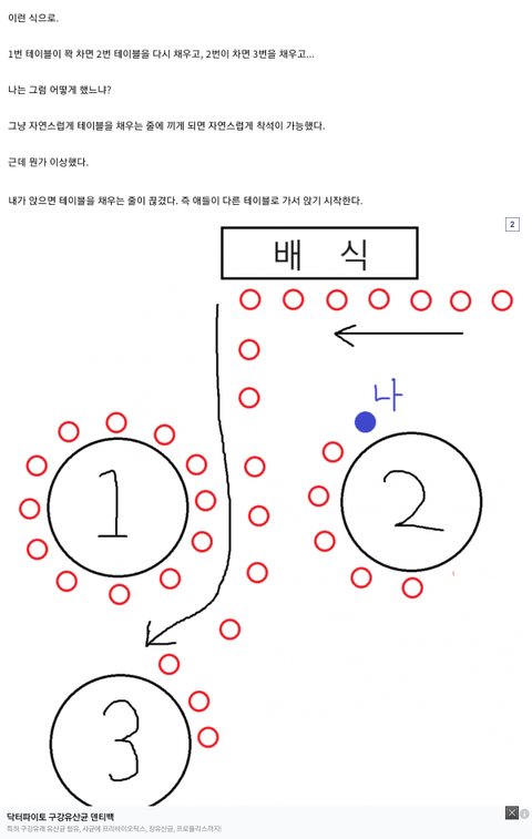 진짜 바퀴벌레 취급하는 애 아닌이상 옆에 가서 밥은 먹음 어차피 본인 옆에 또 친구 앉으니까 걍 무시까면 되거든 ㅇㅇ그리고 테이블 넓은데서 먹는게 편해서 어지간하면 저 왕따 옆자리는 비워두더라도 그 테이블 자체에는 사람이 몇명은 앉았어야함 저 정도로 남들이 모두 피한다? 100% 본인 잘못임 냄새나 음식 먹는게 너무 역겹다든지 반에서 매장당할 짓을 했다든지