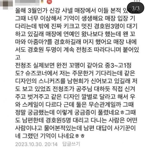 난 그냥 돈 많은사람인가보네 라고 했을텐데 남편이 통찰력이 대단한거같네 지금와서 생각해보면 한국에서 경호원을 5명씩이나 달고다닐필요가없지... 최소한 눈에 보이게 달고다닐 필요는 없음 그정도 사람이면 국가에서 의전을 해줬겠지