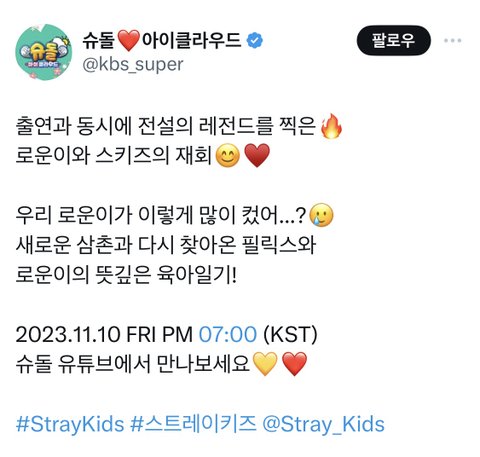 https://x.com/kbs_super/status/1720354152122126423?s=46&t=GFebgezqo7J0ijzsm5Koqg