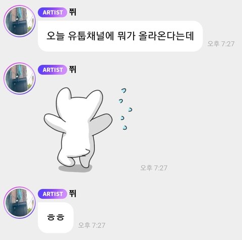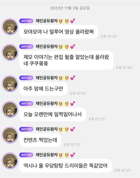 재민이 얼루어 영상에 위버스로 자컨스포에 지성이버블에 어제 앨범 회의에 오늘 나혼산에...재미니 스레드로 멘파하고가고 행보카다