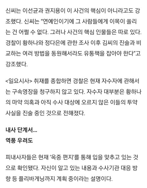 신씨는 "수사기관이 아무리 자수자라 해도 형량 거래가 아닌 구속을 통해 압박하는 방향으로 흘러가야 한다고 생각한다며" "자수자에 대한 불구속 수사가 원칙이라는 암묵적 관행이 오히려 범죄를 키우고 있다. 피내사자들이 옥중 편지로 증거인멸을 준비하고 있을 수 있다는 우려가 강하다"고 토로했다.(여기까지가 기사 내용)