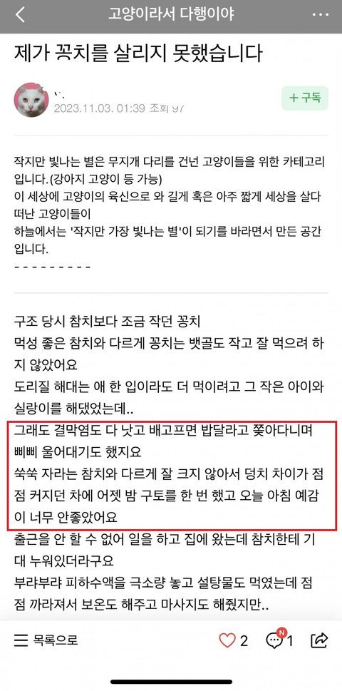 솔직히 이 묘주가 아기 고양이를 격리 시켰는지도 의문이고 이 죽은 개체가 범백이 아닌지도 의심이 되는 상황임.
