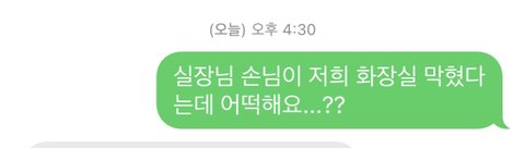 4. 카페 화장실이 막힘 >> 몰랐는데 손님이 와서 막혔다고 알려주더니 내가 여기 오픈할 때부터 왔었는데 이런 적 처음이라고 난 여기 못 있는다 사장한테 얘기해라고 난리 치심 >> 사장님한테 문자로 얘기해둠 >> 다른 손님이 화장실 어디있는지 물어봄 >> 막혀서 사용 못한다고 했더니 그냥 앉아있다가 갑자기 와서 근처에 화장실 없냐하길래 모른다함 >> 어이없다는 듯이 그쪽은 화장실 안 가세요? 시전