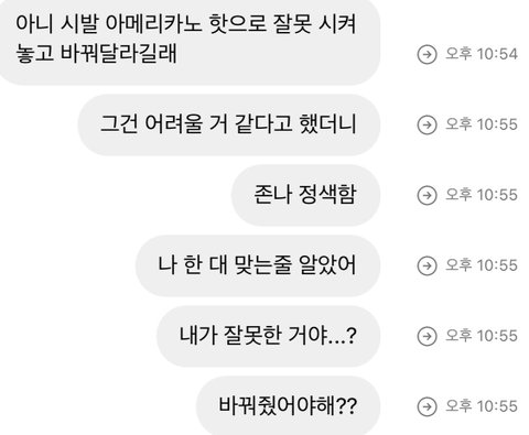 2. 아메리카노 핫으로 잘못시켜놓고 "어?? 제가 핫 시켰어요? 바꿔주세요" 하심 >> 이런적 처음이라 당황해서 "어... 그건 제 재량이 아니라서..." 하니까 뭔 소린지 못 알아드신 거 같길래 "죄송한데 그건 어려울 거 같아요"함 >> 진짜 1분째 나 세워두고 조카 노려보다가 그럼 그냥 버리고 아이스로 달라고 하심