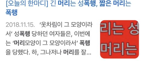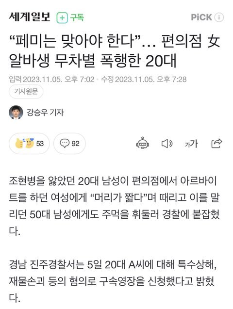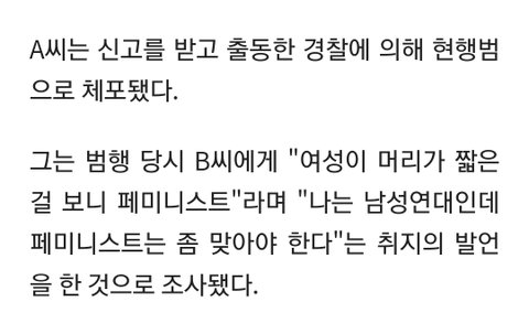 조현병이 원인이지 숏컷이 원인인가 ㅋㅋㅋㅋ 그리고 옆에서 말리던 50대 남자도 같이 맞았는데 아몰랑 여자가 맞았으니 여혐범죄야! 남자 맞은건 알빠노~ 뭐 세상만사 피해자는 다 지들이어야 하나 ㅋㅋㅋ