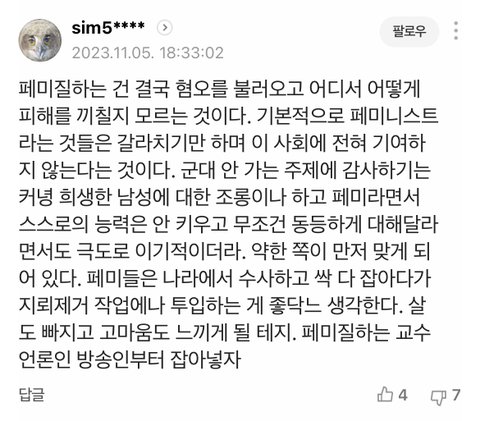 제정신인 한남 없다 여자들은 탈조선이 답이다 정신차리고 탈한남 탈조선하셈