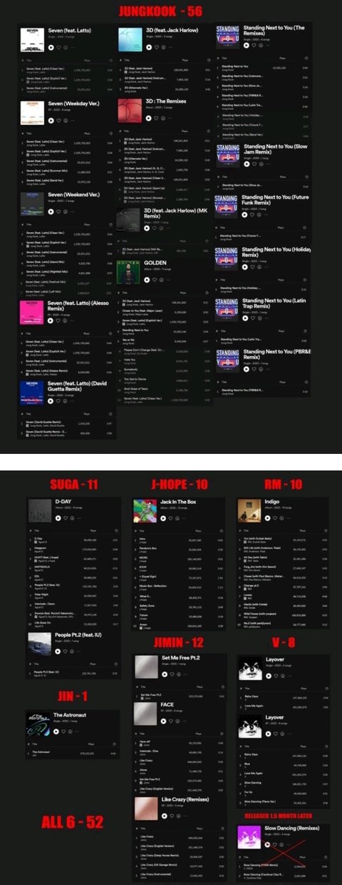 여섯멤버 리믹스 다 합쳐도 정국보다 곡수 적은거 실화야?