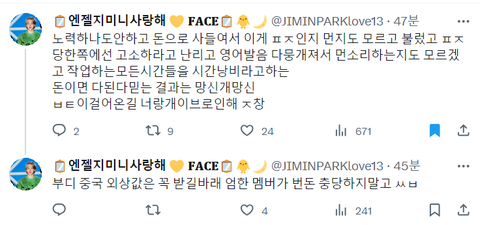 지민 활동할때 주작표 만들어서 뿌리고 다니고 음방도 푸쉬라고 패던거에 비하면 아무것도 아닌데?악개 오픈톡 털린 마갤에서 판 신고계 만들고 서포트 계정으로 악개질 하는 정국악개줌마?