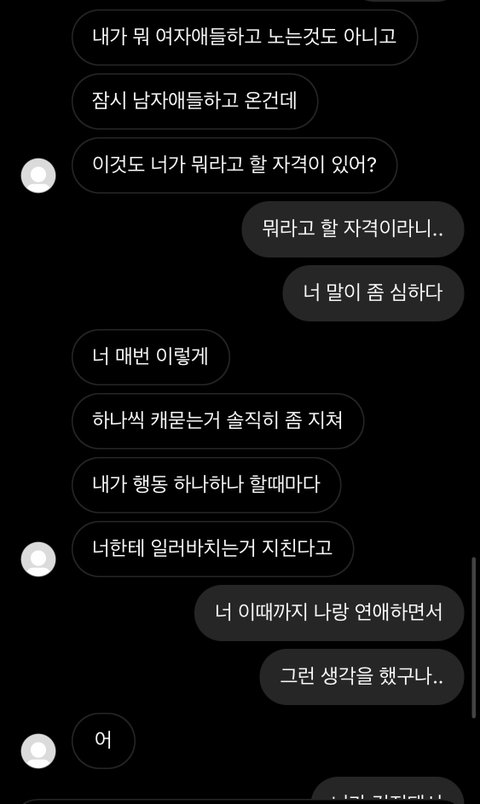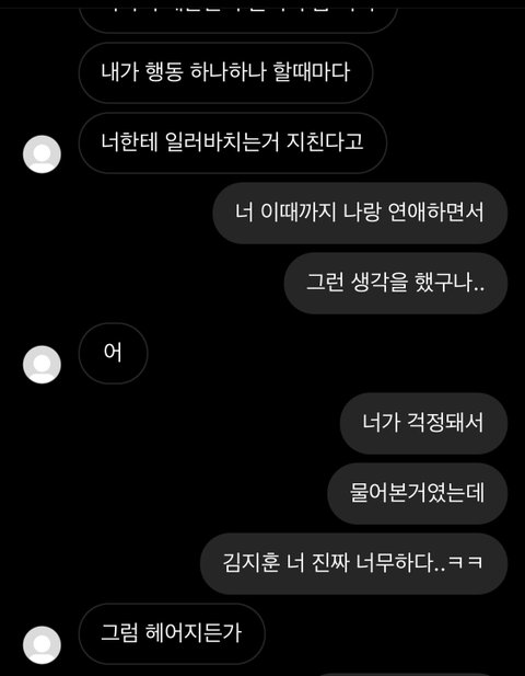 사귄지 1년 조금 넘은 동갑 남친인데 요즘따라 자꾸 나한테 상처주는 말만 해,, 매번 나한테 헤어지자고 말하기도 하고.. 그래도 내가 훨씬 더 좋아해서 결국 오늘 저 디엠 끝나고도 매달렸어…. 이런 내가 잘못된걸까.