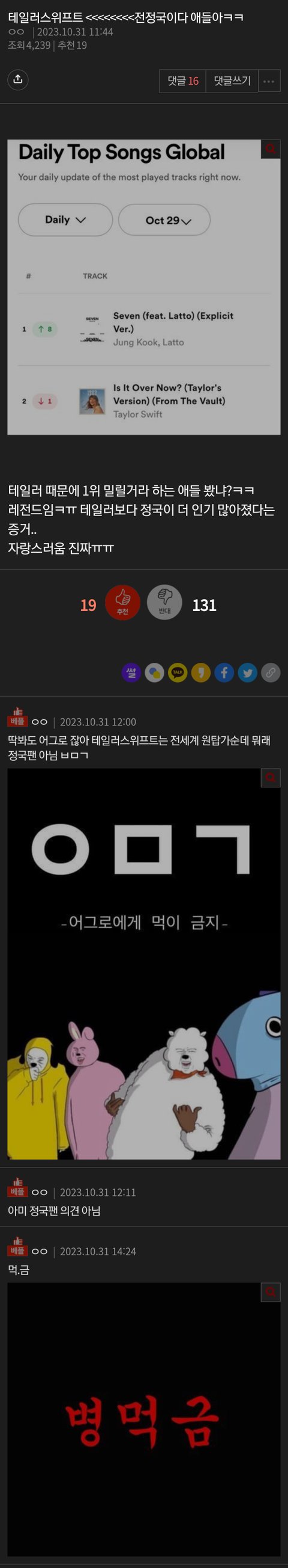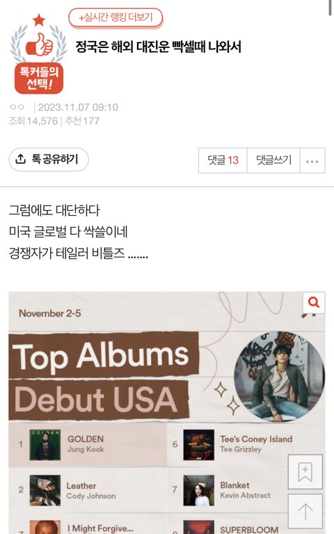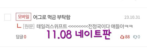 제발 먼저 테일러 언급해놓고 테이 후려치거나 같이 묶여거 가려고 하지 좀 말아주라… 방탄, 정국 안 싫어하는데 자꾸 이런 식으로 언급되니까 그 팬들한테 매우 불쾌함;; 글 제대로 보지도, 정보 제대로 확인도 안 하고서는 톡선까지 보내는 건 진짜 뭔 심리인지 궁금해.. 막말로 엔시티 세븐틴 뉴진스 에스파 같은 그룹이나 라이즈 제베원 보넥도 같이 최근에 뜨는 그룹 팬이 국내 차트 두고 날조해서 저런 글 쓰면 기분 좋겠냐…. 며칠 전 글에서도 미포티도 줄세우기 했다는 거 베플 보내놨는데 정작 미포티 확인해보니까 두 곡 있어서 당황했고만