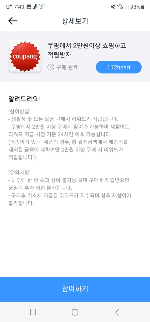 쿠팡은 어차피 사야되는거 있어서 아챔으로 들어가서 삿더니 하트받았네(배송비제외금액으로 책정)