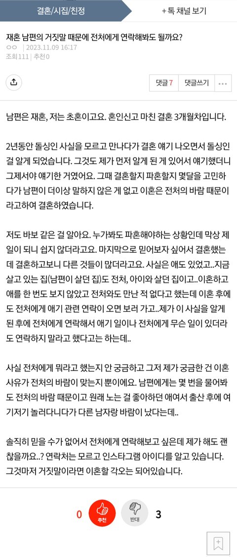 글쓴이입니다. 결혼 전에 알았던 건, 남편이 이혼했었다는 것과 그게 당시 배우자의 외도 때문이었다는 것 뿐이었습니다. 물론 그것도 얘기하지 않았다가 제가 알게된 후에 물어봐 알았지만..그때 결혼하지 않고 그만두었어야했는데 이미 결혼 얘기가 나왔었고 파혼하기 무서웠고 사랑했기에 믿고 싶었습니다. 결혼 후에 남편의 거짓말에 사고가 정상적이지 않았던 것 같습니다. 제가 바보인 것도 맞고, 신중하지 못한 것도 맞고, 지팔지꼰인 것도 맞습니다. 전처에게는 연락하지 않았고 앞으로 할 일도 없습니다. 혼인 기간이 짧아 이후 알게 된 사실들을 종합해 혼인취소소송 준비하려고 합니다. 안 되면 이혼 예정입니다. 글을 삭제한 이유는 ‘뭐라고 하면 들을 거냐, 알아서 판단해라’ 라는 내용의 댓글을 봤고 내가 뭐하는 건가╋내가 알아서 하는 게 맞다는 생각이 들어 삭제하였습니다. 바보 같은 글 읽게 해드려 죄송합니다..
