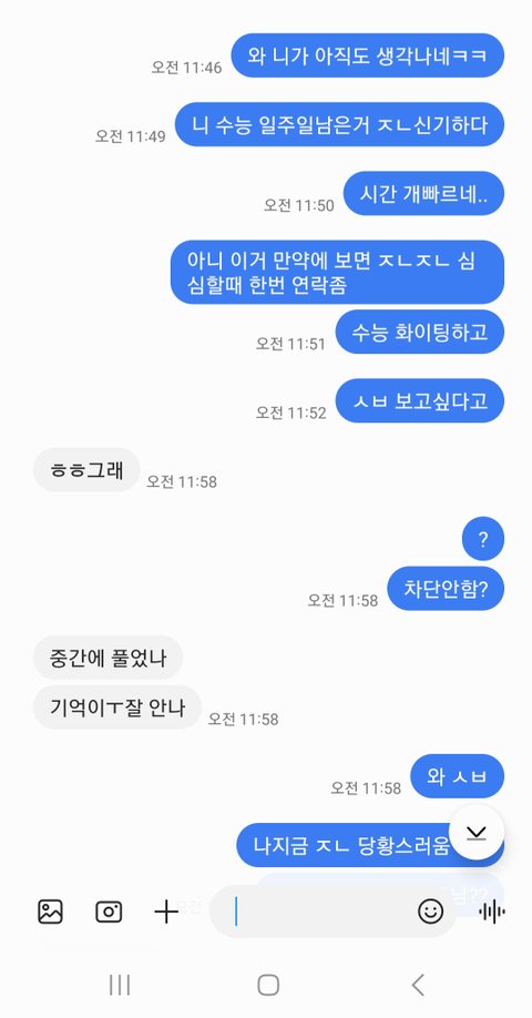 그래서 걍 언젠가 차단메시지 확인할때 발견하든 말든 하라고 별 생각없이 문자 막 보내놨는데 ㅅㅂㅋㅋ 바로 답장옴..
