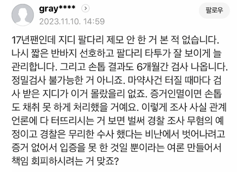 11월6일 자진출두 한 날에도 손톱 그대로 길러서 가서 경찰에서 손톱 제출하고 왔다는데 왜 날조 기사 올려?