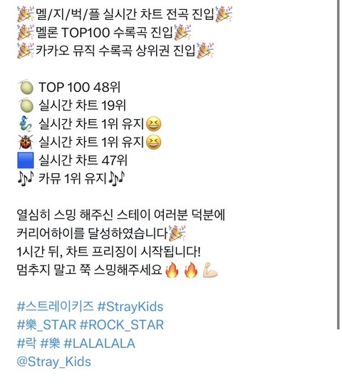 +댓글에 안좋은 말도 있네 .. 난 본문에서 스키즈의 커하라구 했지 다른 아이돌과 비교한 적 없어! 모두가 본인의 페이스대로 성장해가듯 스키즈도 서서히 성장해가고 있다는 걸 알리고 싶은 글이었어 •• 시작점이 느리고 후배 그룹이 쉽게 드는 차트라는 건 기준점이 외부에 있는거잖아, 스키즈의 성장을 스키즈에 집중해서 봐주면 좋겠다!
