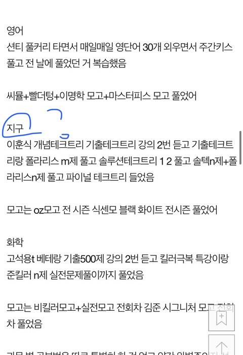 근데 막상 원글을 보면 생명 공부법은 아예 없고 화학 지구 공부법만 있음…심지어 N제랑 실모 풀었어~ 이렇게 쓴거면 생명이라 적어야하는데 지구로 잘못 적었네ㅇㅇ 할 수 있지만 이훈식쌤,오지훈쌤은 누가봐도 지구쌤이기 때문에 헷갈릴 수가 없음
