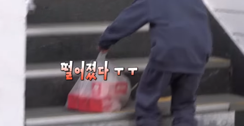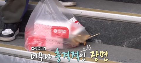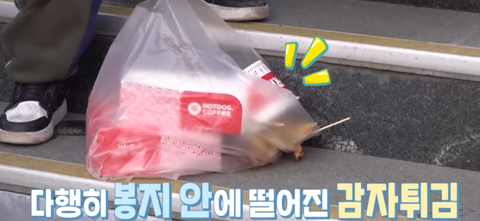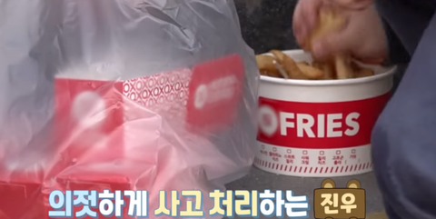 진우가 살짝 봉투를 떨어뜨리며 감자튀김이 쏟아짐