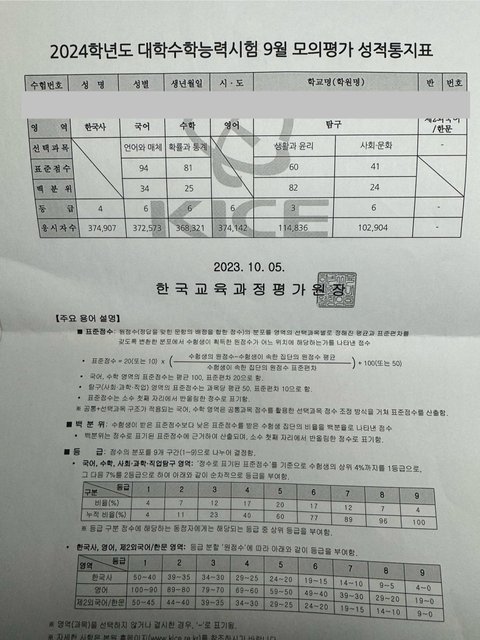 2회 재수생 판녀 수능 성적표